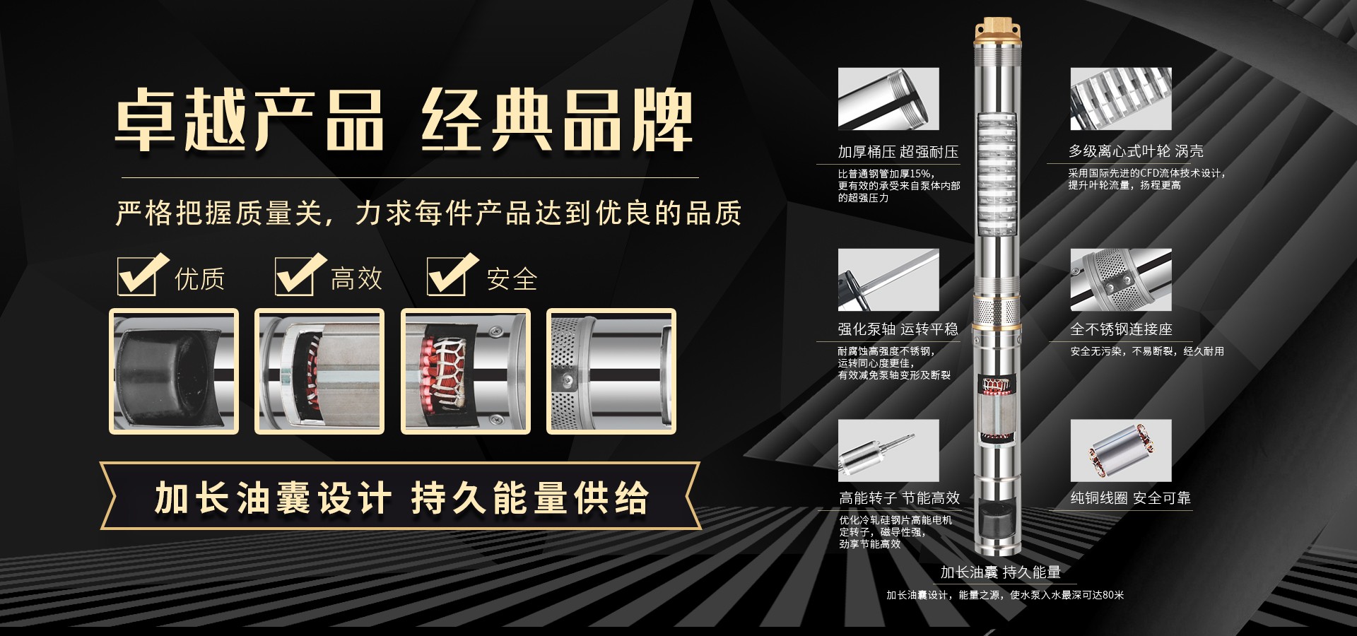 不僅僅是泵,更是流動的科技。十多年來,本公司堅(jiān)持走:以質(zhì)量求生存以科技創(chuàng)新求發(fā)展,重合同守信用的道路,生產(chǎn)經(jīng)營得到迅速發(fā)展。更希望以后不管從發(fā)達(dá)城市到新農(nóng)村,從工業(yè)制造到尖端科技產(chǎn)業(yè)都隨處可見創(chuàng)江井泵的身影,創(chuàng)江深井泵已成為干萬用戶心目中優(yōu)質(zhì)和信心的保證我們將以優(yōu)質(zhì)的產(chǎn)品和最完善的售后服務(wù)來真誠與各界朋友開展廣泛的合作,共同創(chuàng)造一個(gè)美好的未來!